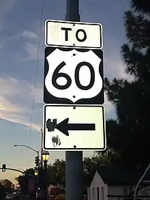 In 1927, what is now US 60 was signed as or roughly followed by SR 74 between the California border near Ehrenburg and Wickenburg, US 89 from Wickenburg to Florence Junction, US 80 from Phoenix to Florence Junction, US 180 from Florence Junction to Globe and US 70 between Springerville and the New Mexico border. The segment of highway between Springerville and Globe had not been constructed yet.[4][5][6] US 60 was extended into Arizona on June 8, 1931, from its original western terminus at US 66 in Springfield, Missouri.[7] While what is now US 60 was under construction between Globe and Springerville, US 60 was temporarily routed down SR 73 as US 60T through San Carlos and McNary. The current route through Show Low was completed sometime between 1935 and 1938.[8] US 60 through Arizona has had far fewer major changes than some other U.S. routes, but one notable example is being replaced by Interstate 10 between Los Angeles, California, and the highway's current terminus near Quartzsite. (The Arizona section of this route was decommissioned in 1982.[9])
