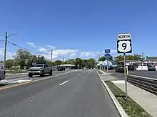 U.S. Route 9 (US 9) is a United States Numbered Highway in the Northeastern U.S., running from Laurel, Delaware, north to Champlain, New York. In New Jersey, the route runs 166.80 miles (268.44 km) from the Cape May–Lewes Ferry terminal in North Cape May, Cape May County, where the ferry carries US 9 across the Delaware Bay to Lewes, Delaware, north to the George Washington Bridge in Fort Lee, Bergen County, where the route along with Interstate 95 (I-95) and US 1 continue into New York City. US 9 is the longest U.S. Highway in the state. From North Cape May north to Toms River in Ocean County, US 9 is mostly a two-lane undivided road that closely parallels the Garden State Parkway and runs near the Jersey Shore. Along this stretch, it passes through the communities of Rio Grande, Cape May Court House, Somers Point, Pleasantville, Absecon, Tuckerton, Manahawkin, Beachwood, and Berkeley Township. In the Toms River area, US 9 runs along the Garden State Parkway for a short distance before heading northwest away from it and the Jersey Shore into Lakewood Township. Upon entering Monmouth County, the route transitions into a multilane suburban divided highway and continues through Howell Township, Freehold Township, Manalapan Township, Marlboro Township, Old Bridge Township, Sayreville, and South Amboy. In Woodbridge Township, US 9 merges with US 1 and the two routes continue through northern New Jersey as US 1/9 to the George Washington Bridge.