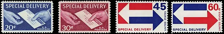 Finally in 1954 a design featuring hands passing a letter went into use. The last image, instituted in 1969, portrayed arrows. Overall philatelists recognize 23 separate issues of special delivery stamps spanning the years 1885 to 1971.[6] In addition, three Airmail Special Delivery stamps were issued in the 1930s, two regular ones and an imperforated issue specially produced by Postmaster General James Farley. In used condition none of the special delivery stamps are particularly scarce.