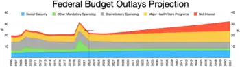 The U.S. federal government is obligated under current law to make mandatory payments for programs such as Medicare, Medicaid and Social Security. The Government Accountability Office (GAO) projects that payouts for these programs will significantly exceed tax revenues over the next 75 years. The Medicare Part A (hospital insurance) payouts already exceed program tax revenues, and social security payouts exceeded payroll taxes in fiscal year 2010. These deficits require funding from other tax sources or borrowing.[31] The present value of these deficits or unfunded obligations is an estimated $45.8 trillion. This is the amount that would have had to be set aside in 2009 in order to pay for the unfunded obligations which, under current law, will have to be raised by the government in the future. Approximately $7.7 trillion relates to Social Security, while $38.2 trillion relates to Medicare and Medicaid. In other words, health care programs will require nearly five times more funding than Social Security. Adding this to the national debt and other federal obligations would bring total obligations to nearly $62 trillion.[32] However, these unfunded obligations are not counted in the national debt, as shown in monthly Treasury reports of the national debt.[33]