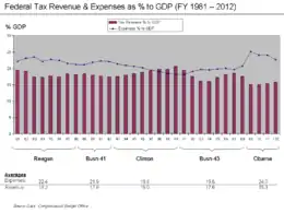 Public debt rose sharply during the 1980s, as Ronald Reagan negotiated with Congress to cut tax rates and increase military spending. It fell during the 1990s because of decreased military spending, increased taxes and the 1990s boom. Public debt rose sharply during George W. Bush's presidency and in the wake of the 2007–2008 financial crisis, with resulting significant tax revenue declines and spending increases, such as the Emergency Economic Stabilization Act of 2008 and the American Recovery and Reinvestment Act of 2009.[14]