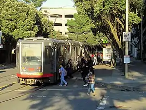 UCSF Parnassus station is a pair of light rail stops on the Muni Metro N Judah line, located in the Inner Sunset neighborhood of San Francisco, California. The stops are located at Irving and 2nd Avenue in the westbound direction and Irving and Arguello in the eastbound direction. They opened with the N Judah line on October 21, 1928. They are the primary stop for the Parnassus campus of the University of California, San Francisco.