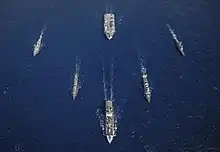 In the Gulf of Aden, the carrier strike group met with two U.S. Navy task groups, Carrier Strike Group 5 headed by USS Ronald Reagan and USS Iwo Jima's Amphibious Ready Group.[37] The carrier strike group then exercised with the Indian Navy in the Bay of Bengal before exercising with the navies of Singapore, Malaysia and Thailand in the Strait of Malacca.[38][39] Finally, in the Indo-Pacific region, the strike group exercised with the Japanese Maritime Self-Defence Force and Republic of Korea Navy.[40]