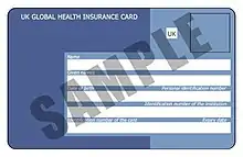 The UK Global Health Insurance Card (GHIC) is a card issued by the NHS Business Services Authority on behalf of the Department for Work and Pensions in the United Kingdom. It is issued free of charge to anyone covered by the social security system of the United Kingdom and provides evidence of entitlement to the provision of healthcare services under the UK's reciprocal healthcare agreements with the European Union, Switzerland,[1] Montenegro[2] and the Bailiwick of Guernsey.[3] It is also accepted by Australia as proof of eligibility to enrol in Medicare.[4]