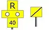 When there is a station between the warning board and the commencement board, a yellow repeater warning board showing an R is positioned beyond the end of platforms to remind drivers of the restriction ahead.[15]