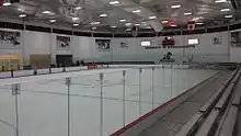 The Minutewomen got a new head coach in 2012–13 when Bill Wright took over for Chris Cobb, who had taken a coaching job in NCAA Division III with Williams College.[11] Wright inherited a strong team that already included the aforementioned stars, along with key freshmen Ally Perdios and Jess Greenwood, and Penn State transfer Paige Harrington. By the end of the regular season, were ranked second only to Liberty. That bit of history was made possible by another: UMass' first-ever ECWHL tournament title, thanks to a 2–1 title game win over defending ACHA national champion Northeastern.[12] An impressive journey at the ACHA National Tournament in Ashburn, Virginia followed, with an opening 3–2 win over 2011 national champ Michigan State, as second-period goals from Oteri, Labossiere and Chelsea Bräm turned around an early 2–0 deficit.[13] Although Northeastern took an ECWHL final rematch in the day one nightcap (the first day of the tournament involved two pool games played by each team at the time),[14] two more Oteri goals delivered a vital 2–1 victory over Robert Morris (IL)[15] that, along with tiebreaker help, sent UMass through to the semifinals for the third time in program history. Once there, however, eventual champ Minnesota jumped on the Minutemen for three goals in the first ten minutes of the contest en route to a 5–1 result.[16]
