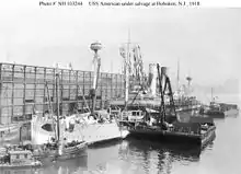 Rear Admiral Gleaves arrived at the dock soon after the ship sank, the water covering her main deck, to see personally what had happened to one of the largest transports in the Cruiser-Transport Force. Before the day was out, a court of inquiry began meeting to determine what had happened. Over the ensuing days, salvage efforts continued, including the removal of guns, cargo, and other equipment, as well as the search for the six men unaccounted for at muster. Eventually, the bodies of all, four soldiers and two sailors, were recovered. Divers worked continuously, closing open ports (almost all on "G" deck had been left open to allow the air to be cleared of the smell of disinfectants that had been used to cleanse and fumigate the compartments). She was raised and refloated on 21 November 1918, 10 days after the armistice was signed ending World War I. On 16 December, America was towed by 10 tugboats to the New York Navy Yard where she remained undergoing the extensive repairs occasioned by her sinking, well into February 1919.