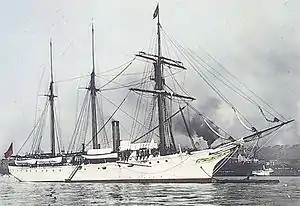 Carlile P. Patterson departed Hampton Roads for the west coast on July 30, 1884. She traveled by way of the Straits of Magellan, with stops at Madeira, Rio de Janeiro, Montevideo, Punta Arenas, Valparaíso, Callao, Panama, San Diego, and Santa Barbara. She arrived at San Francisco February 13, 1885, and immediately began preparations for her first season of surveying.[4] She left for Sitka April 26 and began survey work May 27.