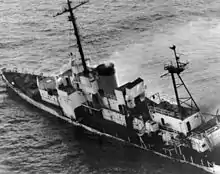After conversion to an Amphibious Command Ship (Type AGC) in the Boston Navy Yard between 4 January and 28 March 1945, Campbell was assigned to duty in the Pacific as an Amphibious Flagship. She sailed from Pearl Harbor for Saipan and arrived on 3 August 1945, sailing again for Manila on 10 August, and Leyte on 19 August. On 1 October 1945 she was anchored at Wakanoura Wan, Honshū, Japan as the flagship for Communications Service Division 103. On 30 October she sailed to Sasebo and stayed until 30 November when she was ordered back to the U.S.[1] In August 1948, Campbell found wreckage from an Air France Latécoère 631 aircraft which had crashed into the Atlantic Ocean with the loss of all 52 people on board.[12] In January 1959, Campbell was one of the ships which answered the distress call of Hans Hedtoft which had struck an iceberg off Greenland. She participated in the search until it was called off on 7 February.[13]