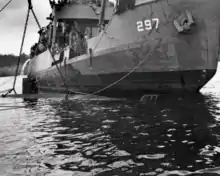 In January 1945 Ironwood sailed to Guadalcanal where Japanese midget submarine HA-37 had been discovered in shallow water off Cape Esperance. The two-man crew of the sub had aborted their mission and had run it ashore after discovering its depth regulator was faulty.[11] It took more than two weeks for divers to work a lifting bridle around the sub. On January 25, 1945 Ironwood raised the sub and towed it to Florida Island. Navy mine disposal officers were unable to remove its torpedoes, so after the sub was searched, it was sunk.[12]