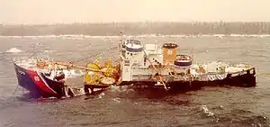 USCGC Acacia, USCGC Katmai Bay, and CCGS Samuel Risley responded to the scene.[45] Up to 1,800 feet (550 m) of oil containment boom was deployed to capture a diesel fuel leak from Mesquite.[43] High winds and waves up to 10 feet (3.0 m) battered the grounded ship on December 8 and 9, damaging the hull further, tearing off her rudder, and toppling her mast. The Coast Guard concluded at this point that the ship could not be salvaged in winter conditions.[46] Instead, efforts were made to pump off the remaining fuel, salvage high value equipment, and seal the ship for the winter.[47] On January 4, 1990 the Coast Guard announced that it would decommission Mesquite on January 31, 1990. Her damage was so great that it would not be worth attempting to restore her to service.[48]