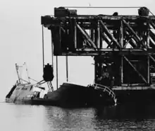 After the storm of December 8 and 9, 1989, salvors concluded that she could not be patched, pumped out, and refloated. The wreck would have to be lifted off the shoal and carried to her sinking site. To achieve this lift, a barge was chartered and a pair of lowering trusses originally used by Shell Oil for platform construction at its COGNAC oil field in the Gulf of Mexico were mounted on it. The heavy-lift barge was towed from Port Newark, New Jersey to Lake Superior during May 1990.[44]