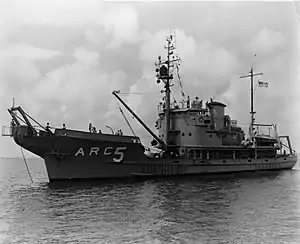 ![]() Cable repair ship USS Yamacraw (ARC-5) at anchor. | |