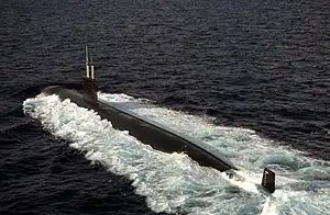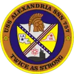 USS Alexandria (SSN-757), is a Los Angeles class nuclear-powered attack submarine and the third vessel of the United States Navy to be named for both Alexandria, Virginia, and Alexandria, Louisiana.[2] The contract to build her was awarded to the Electric Boat Division of General Dynamics Corporation on 26 November 1984. Her keel was laid down in Groton, Connecticut, on 19 June 1987.[10] She was launched on 23 June 1990, sponsored by Mrs. Myrtle "Tookie" Clark, wife of Vice Admiral Glenwood Clark (ret.), and commissioned on 29 June 1991.[1] Alexandria was placed in service on 22 March 1991. A series of sea trials began 16 April and were completed 4 June.[1]