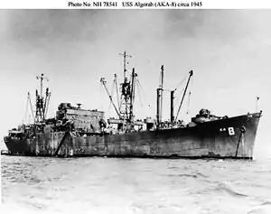 On 4 June 1941 the Maritime Commission, Division of Emergency Shipping, announced negotiated acquisition of twenty-eight vessels of which twenty-one were to be turned over to the Navy, Mormacwren being one, and seven to be turned over to the Army.[7] Mormacwren was delivered to the Navy on 6 June 1941 with conversions made at the Boston Navy Yard.[1][8] On 15 June 1941 the ship was commissioned as USS Algorab (AK-25), named for a star in the constellation Corvus, at Boston, Massachusetts.[1] On 1 February 1943 Algorab was reclassified as an Arcturus-class attack cargo ship attack cargo ship, hull number AKA-8. She served as a commissioned ship for 4 years and 5 months.[1]