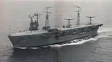 The conversion from CVE to AGMR involved the modification of the flight deck to include a hurricane bow, removal of Second World War armament and the addition of four radar controlled twin 3-inch 50 caliber anti-aircraft gun mounts, two per side.