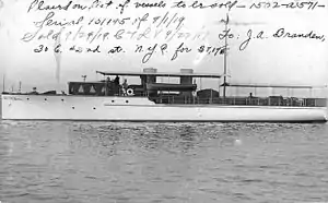 Aurore II was built as a private steam[3] yacht or motorboat[4] of the same name in 1916 by the Luders Marine Construction Company at Stamford, Connecticut. On 10 August 1917, the U.S. Navy purchased Aurore II from Stuart Wyeth of Philadelphia, Pennsylvania, for use as a section patrol vessel during World War I. She was commissioned at the Philadelphia Navy Yard as USS Aurore II (SP-460) on 1 October 1917.