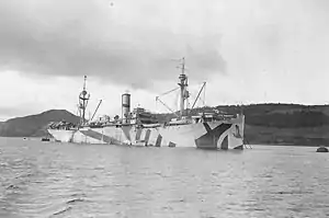![]() USS Black Hawk (ID # 2140) Moored at Inverness, Scotland, in September 1918, while serving as Mine Force repair ship and flagship, and painted with a camouflage pattern. | |
