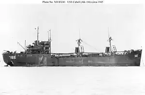 ![]() USS Cabell (AK-166) at anchor, location unknown, c. late 1945. | |