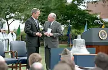 One of the ship's propellers was placed on display at the Los Angeles Maritime Museum.[10] The ship's bell was kept in storage, and despite US law preventing the possession of naval artefacts by other nations, a campaign led to the bell being presented to Australian Prime Minister John Howard by US President George W. Bush on 10 September 2001, as commemoration for the 50 years of the ANZUS treaty.[11] The 250-pound (110 kg) bell was placed on display in the USA Gallery of the Australian National Maritime Museum.[11]