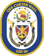 The colors of the field red, white, and blue, stand for the United States. The saltire recalls the heritage of the South in the history of Carter Hall in Millwood, Virginia. The anchor represents the Navy. The times are in the form of pheons, symbolizing the mission of support to assault operations. The loose rope intertwined with the anchor signifies freedom. The border denotes unity. Dark blue and gold are the colors traditional associated with the Navy; red for courage, white for integrity. The griffin denotes courage and vigilance. The crown refers to the heritage of Carter Hall, recalling the Great grandfather of its builder, known as "King" Carter. The battle stars of the first Carter Hall (LSD-3) are commemorated by the arc of battle stars, five gold for her service in Vietnam. The motto is underscored by the olive branch for peace and the oak for war. Gold is for excellence and red for courage. The arms are emblazoned on a white oval enclosed by a blue collar edge on the outside with a gold rope and bearing the inscription "USS Carter Hall" at the top and "LSD-50" at the bottom in gold.