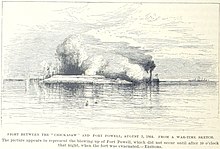 The two Milwaukee-class ships bombarded Fort Morgan for about an hour and a half while the wooden ships passed through the mouth of Mobile Bay. Chickasaw fired 75 rounds at the fort beginning at 07:10; the return fire badly damaged her funnel so that the crew was forced to use tallow and coal tar to generate enough steam to keep the ship in the fight. She engaged the Tennessee two hours later until the ironclad surrendered at 10:40.[10] The Confederate ironclad was shooting at the wooden ships at this time at point-blank range in a chaotic melee with both sides making multiple attempts to ram each other. Chickasaw remained off the Tennessee's stern through their engagement and fired on her at ranges between 10 to 50 yards (9.1 to 45.7 m). None of her 52 shells penetrated their target's armor, but they did jam shut several of the armored shutters that protected the aft gun ports, including the stern gun port at 09:40.[11] Perkins claimed that his ship shot away the Tennessee's flagstaff, smokestack and the exposed steering chains that controlled her rudder. Chickasaw was struck 11 times during the action, with one shot penetrating her deck that set some of the crew's hammocks on fire.[10] Two of Chickasaw's sailors, Chief Boatswain's Mate Andrew Jones and Master-at-Arms James Seanor, were later awarded the Medal of Honor for their actions during the battle.[12][13]