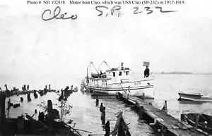 Cleo was built as a civilian motorboat of the same name in 1908 by Johnson at Marine City, Michigan. She was in the service of the Michigan State Game, Fish and Forestry Department when the U.S. Navy acquired her from the State of Michigan and placed her in service as USS Cleo (SP-232) in April 1917 for World War I service as a patrol vessel. Sources differ on whether she was commissioned[2] or served in a non-commissioned status.[3]