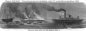 USS Clifton playing a fire hose on a Confederate fire raft on the lower Mississippi River, 17 April 1862