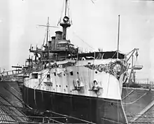 As part of the US response to Germany's unrestricted submarine warfare, Connecticut was recommissioned on 3 October 1916. Two days later, Admiral Herbert O. Dunn made her the flagship of the Fifth Battleship Division, transferring his flag from Minnesota.[69] Connecticut operated along the East Coast and in the Caribbean until the United States entered World War I on 6 April 1917.[6][70] For the duration of the war, Connecticut was based in York River, Virginia.[22] More than 1,000 trainees—midshipmen and gun crews for merchant ships—took part in exercises on her while she sailed in Chesapeake Bay, and off the Virginia Capes.[6][69]