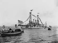 Connecticut was ordered on 1 July 1902.[2] On 15 October 1902, she was awarded to the New York Naval Shipyard.[3] She was laid down on 10 March 1903,[4][3][5] and launched on 29 September 1904.[3][5] She was sponsored by Miss Alice B. Welles, granddaughter of Gideon Welles, Secretary of the Navy during the American Civil War.[6] A crowd of over 30,000 people attended the launch,[7] as did many of the Navy's ships. The battleships Texas, Massachusetts, Iowa, Kearsarge, Illinois, Alabama, Maine, and Missouri were at the ceremony, along with the protected cruisers Columbia and Minneapolis and the auxiliary cruiser Prairie.[8]