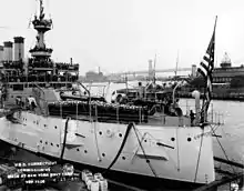 Connecticut was the leader of the ships that passed in review during the Presidential Fleet Review in New York, on 2 November; she then remained in New York, until 12 January 1912, when she returned to Guantánamo Bay. During a March overhaul at the Philadelphia Naval Yard, the battleship relinquished her role as flagship to the armored cruiser Washington. After the overhaul's completion, Connecticut's activities through the end of 1912 included practicing with torpedoes in Fort Pond Bay, conducting fleet maneuvers, and battle practice off Block Island and the Virginia Capes.[61] Stopping in New York, Connecticut conducted training exercises in Guantánamo Bay from 13 February to 20 March; during this time (on the 28th), she once again became the Atlantic Fleet flagship for a brief and final time when she served in the interim as Rear Admiral Charles J. Badger transferred his flag from Wyoming to Utah.[62][63] After taking on stores in Philadelphia, Connecticut sailed for Mexico and arrived on 22 April; she was to patrol the waters near Tampico and Vera Cruz, protecting American citizens and interests during disturbances there and in Haiti.[6][64]