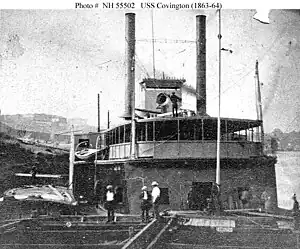 Covington, a side wheel steamer, was purchased in February 1863 from Samuel Wiggins at Cincinnati, Ohio; fitted for service at Cairo, Illinois; and assigned to the Mississippi Squadron, Acting Volunteer Lieutenant George P. Lord in command. Serving in the Tennessee River to convoy Union Army transports and other ships, Covington had frequent encounters with Confederates along the banks. On 18 June, she was transferred to the Mississippi River for similar duty on that river and the White, Black, and Red Rivers. Arriving at Memphis, Tennessee, on 20 June 1863, she sailed the following day convoying General Lyon and Little Rebel. She seized the steamer Eureka at Commerce, Missouri, on 2 July for violation of the river blockade and sent her into Cairo. On 6 August she aided Paw Paw, sunk by a snag.