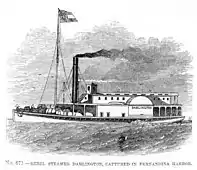 Darlington, a Confederate 300 ton steamer, was captured by boats from USS Pawnee in Cumberland Sound, Florida, 3 March 1862, with a cargo of army wagons, ammunition, and camp equipment on board.