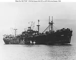De Grasse was launched 24 February 1943, as liberty ship SS Nathaniel J. Wyeth by the Oregon Shipbuilding Corporation, Portland, Oregon, under a Maritime Commission contract. She was sponsored by Mrs. V. Palmer, acquired by the Navy on 28 October 1943, and converted by the United Engineering Company in Alameda, California. De Grasse was commissioned 8 November 1943. She was reclassified AK-223, 20 August 1944.