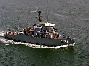 Her next significant deployment took place in early June 1980, when Dominant sailed to the Straits of Florida, whose waters were flooded with Cuban refugees during the mass migration known as the Mariel boatlift.[1] During her week-long operations in the Straits of Florida (5 – 11 June 1980), Dominant rescued refugees from several over-crowded and sinking small craft. At one point the minesweeper was challenged by a Cuban Revolutionary Navy gunboat, which demanded the return of a specific refugee, but Dominant refused the demand.[2]