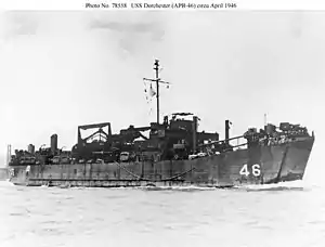 ![]() USS Dorchester (APB-46) probably returning to San Francisco from the Western Pacific on 9 April 1946. | |