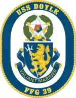 USS Doyle (FFG-39) was the 30th ship to be constructed in the Oliver Hazard Perry class of guided missile frigates of the United States Navy. Doyle was named after Vice Admiral James Henry Doyle (1897–1982). Vice Admiral Doyle was most known for his contributions during the Korean War as Commander Amphibious Group One. The ship was in service from 21 May 1983 to 29 July 2011. During her 28 years of service, Doyle went on at least six deployments to the Mediterranean Sea and two deployments to the Persian Gulf, including participation in Operation Earnest Will. The ship also operated in the Black Sea, Baltic Sea, and deployed to operate with the Middle East Force. Doyle took part in UNITAS 39-98. Deployed to the Standing Naval Forces Atlantic, and conducted three Southern Command Deployments.[1]