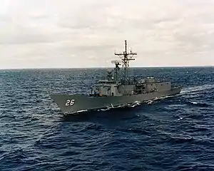 USS Gallery (FFG-26), eighteenth ship of the Oliver Hazard Perry class of guided-missile frigates, was named for three brothers: Rear Admiral Daniel V. Gallery (1901–1977), Rear Admiral William O. Gallery (1904–1981), and Rear Admiral Philip D. Gallery (1907–1973). Ordered from Bath Iron Works, Bath, Maine, on 28 February 1977 as part of the FY77 program, Gallery was laid down on 17 May 1980, launched on 20 December 1980, co-sponsored by Mrs. Philip D. Gallery and Mrs. Daniel V. Gallery, and commissioned on 5 December 1981, commanded by Commander Norman Stuart Scott. Decommissioned and stricken on 14 June 1996, she was transferred to Egypt on 25 September 1996 as Taba (F916). As of 2007, she remained in active service with the Egyptian Navy.[1]