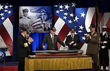 The contract to build CVN-77 was awarded to Northrop Grumman Shipbuilding Newport News on 26 January 2001. A naming ceremony was held on 9 December 2002 at Northrop Grumman Newport News, with former president George H.W. Bush attending.[18] Secretary of the Navy Gordon R. England, presided at the ceremony.