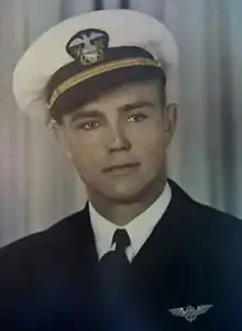 Don T. Griswold, Jr. was born on 8 July 1917 in Bryan, Texas. He attended Iowa State and after graduation joined the Naval Aviation Corps. On 6 June 1942 during the Battle of Midway, his Douglas SBD-3 "Dauntless" scout-bomber scored a hit on a Japanese ship but was hit by antiaircraft fire and plunged into the sea. Griswold's radioman-gunner, Kenneth Cecil Bunch, also died. Griswold was posthumously awarded the Distinguished Flying Cross.