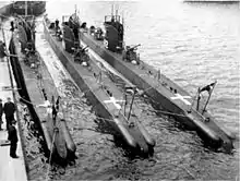 For surface running, they were powered by two New London Ship & Engine Co. 475-brake-horsepower (354 kW) diesel engines, each driving one propeller shaft. When submerged each propeller was driven by a 170-horsepower (127 kW) Electro Dynamic Co. electric motor. They could reach 14 knots (26 km/h; 16 mph) on the surface and 10.5 knots (19.4 km/h; 12.1 mph) underwater.[1] On the surface, the boats had a range of 2,300 nautical miles (4,300 km; 2,600 mi) at 11 knots (20 km/h; 13 mph) and 100 nmi (190 km; 120 mi) at 5 knots (9.3 km/h; 5.8 mph) submerged.[2]