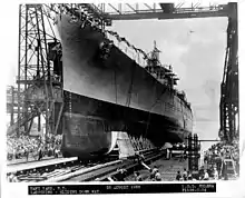 The US Navy awarded the contract for Helena to the New York Navy Yard on 9 September 1935, and the keel for the new ship was laid down on 9 December 1936. Her completed hull was launched on 28 August 1938, and after completing fitting-out, she was commissioned into the fleet on 14 December 1939 with the hull number CL-50.[2][16] World War II had broken out in Europe in September that year, but for the time being, the United States remained neutral. After entering service, the ship was occupied with sea trials and initial training, and she embarked on a major shakedown cruise abroad on 27 December, bound for South American waters. She stopped in Guantanamo Bay, an American-leased naval base in Cuba, on the way before arriving in Buenos Aires, Argentina, on 22 January 1940; from there, she continued on to Montevideo, Uruguay, on 29 January. While in the latter port, the crew inspected the wreck of the German heavy cruiser Admiral Graf Spee that had recently been scuttled after the Battle of the River Plate the previous month. Helena got underway again in mid-February to return to the United States, again passing through Guantanamo Bay on the way. After returning, she was dry-docked for repairs from 2 March to 14 July.[16][17]