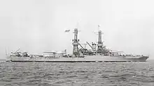 Idaho was laid down on 20 January 1915 at the New York Shipbuilding Corporation in Camden, New Jersey. She was launched on 30 June 1917, and after fitting-out work ended, the new battleship was commissioned into the fleet on 24 March 1919.[1] Shortly afterward, the ship began her shakedown cruise, departing on 13 April for Guantánamo Bay, Cuba, before returning to New York. There, the President of Brazil, Epitácio Pessoa, boarded the ship to return to Brazil. The trip began on 6 July; Idaho reached Rio de Janeiro on 17 July, where Pessoa left the ship, and continued on to the Panama Canal. She steamed to Monterey, California, where she joined the Pacific Fleet in September. The fleet then conducted a series of training exercises and held a naval review on 13 September for President Woodrow Wilson. Idaho hosted the Secretary of the Navy Josephus Daniels and the Secretary of the Interior John B. Payne for a tour of Alaska, which concluded on 22 July.[8]