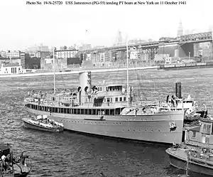 USS Jamestown (PG-55) was a patrol gunboat and after 13 January 1943 a Jamestown-class motor torpedo boat tender acquired by the U.S. Navy during World War II. Her task in her final classification was to provide a "home base" for torpedo boats in remote parts of the ocean during the war, and to provide them with necessary services, such as fuel, food, and repairs.