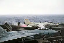 In July 2004 John F. Kennedy collided with a dhow in the Persian Gulf, leaving no survivors on the traditional Arab sailing boat.[20] After the incident the Navy relieved the commanding officer of John F. Kennedy. The carrier herself was unscathed, but two jet fighters on the deck were damaged when an F-14B Tomcat assigned to VF-103 slid into an F/A-18C Hornet assigned to VFA-81 damaging the wing of the F-14 as well as the upper section of the radome and forward windscreen of the F/A-18 as the ship made a hard turn to avoid the tiny vessel. A popular misconception is that John F. Kennedy's captain waited to make the turn at the last possible moment to recover aircraft critically low on fuel returning from airstrikes. The official review board determined this was not the case and the aircraft could have remained safely aloft until John F. Kennedy maneuvered to avoid the dhow.[21]