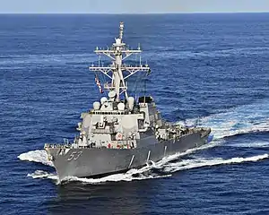 USS John Paul Jones (DDG-53) is the third Arleigh Burke-class guided missile destroyer in the United States Navy and the first ship of the class homeported on the west coast. She is the fifth ship named after American Revolutionary War naval captain John Paul Jones and the second to carry his first name. She was built at Bath Iron Works in Bath, Maine. The ship is part of Destroyer Squadron 9 of Carrier Strike Group 11, which is headed by the nuclear-powered aircraft carrier USS Nimitz (CVN-68).[4]