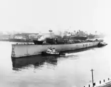 Kentucky's construction was plagued by suspensions. Her keel was laid down at the Norfolk Navy Yard, Portsmouth, Virginia, on 7 March 1942.[5] However, work on the ship was suspended in June that year, and Kentucky's bottom structure was launched to make room for LST construction on 10 June.[5][17][18] Work on the ship resumed on 6 December 1944, when the keel structure was moved to Dry Dock 8. Work on the battleship proceeded at a slow pace, and her completion was projected for the third quarter of 1946. In December 1945 it was recommended that Kentucky be completed as an anti-aircraft battleship, and work on the ship was suspended in August 1946 while this was considered. Construction resumed again on 17 August 1948 without any decision having been made on her final design.[5] Work on Kentucky continued until 20 January 1950, when it was decided to halt work on the ship.[19] Following this, she was floated out of her drydock to clear a space for repairs to sister ship Missouri, which had run aground en route from Hampton Roads.[20][21]