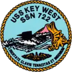 The submarine insignia symbolizes the heritage that the ship has with all past and future submarines. The motto "Liberate Clavis Tenacitas et Ingenium" translates to "The Key to Freedom is Tenacity and Resourcefulness". Specifically, the phrase "The Key to Freedom" represents the namesake city and the submarine's mission to protect the fundamental rights and liberties of the American people.[11] The phrase "Tenacity and Resourcefulness" was used by the Mayor of Key West during his speech at the ship's launching to describe the characteristics of a true Conch —a native of Key West. Additionally, "Ingenium" is a word used by the ancient Greek and Roman historians to describe the resourcefulness and ingenuity of sailors in the period.[12]