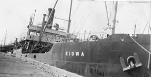 ![]() SS Kiowa in port, probably around the time of her inspection for U.S. Navy service by the 3rd Naval District. | |