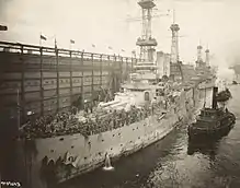 Louisiana joined the Great White Fleet on 16 December 1907, when they departed Hampton Roads to begin their circumnavigation of the globe.[3] The cruise of the Great White Fleet was conceived as a way to demonstrate American military power, particularly to Japan. Tensions had begun to rise between the United States and Japan after the latter's victory in the Russo-Japanese War in 1905, particularly over racist opposition to Japanese immigration to the United States. The press in both countries began to call for war, and Roosevelt hoped to use the demonstration of naval might to deter Japanese aggression.[4] The fleet cruised south to the Caribbean and then to South America, making stops in Port of Spain, Rio de Janeiro, Punta Arenas, and Valparaíso, among other cities. After arriving in Mexico in March 1908, the fleet spent three weeks conducting gunnery practice.[5] The fleet then resumed its voyage up the Pacific coast of the Americas, stopping in San Francisco and Seattle before crossing the Pacific to Australia, stopping in Hawaii on the way. Stops in the South Pacific included Melbourne, Sydney, and Auckland. [6]